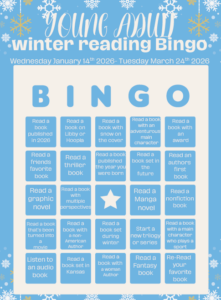 Winter Reading Bingo for the Teens! Stop by the Teens and Technology Area to pick up your bingo card, or save the image below. Return your bingo card by March 24th to earn prizes! Let’s Read!