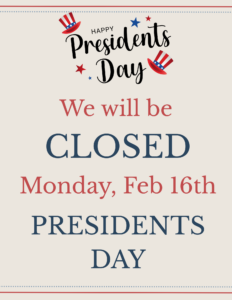 We will be closed on Monday, February 16th for Presidents Day