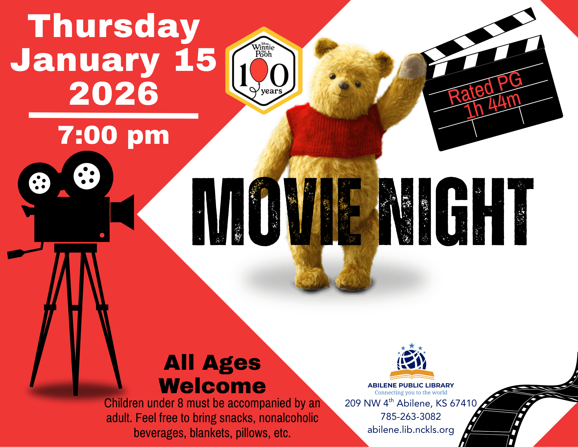 Celebrate 100 years of Winnie the Pooh with us! Movie is rated PG and 1h 44m long. All ages welcome but children under 8 must be accompanied by an adult. Feel free to bring snacks, nonalcoholic beverages, blankets, pillows, etc. |