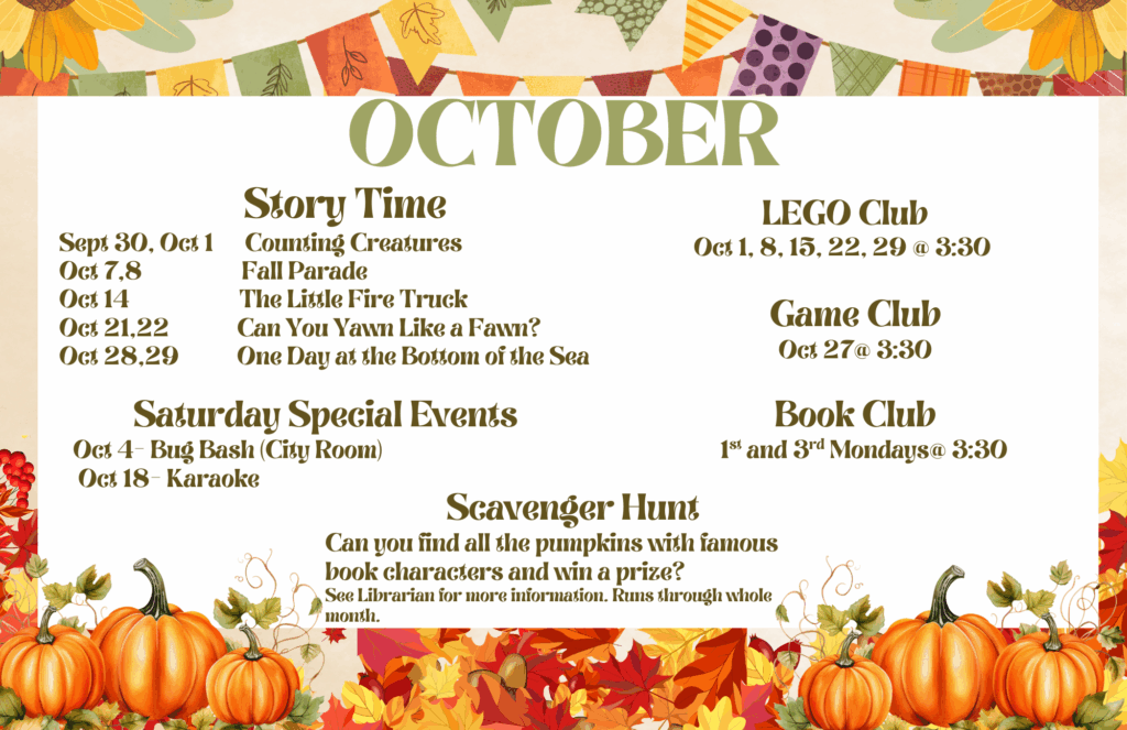 Check out all the fun things happening in October in the Children’s Library! Oct 4 – Bug Bash! Wee Read Story Time on Tuesdays and Wednesdays LEGO Club on Wednesday afternoons Game Club, Book Club, a Scavenger Hunt, and also fun activities on Saturdays!