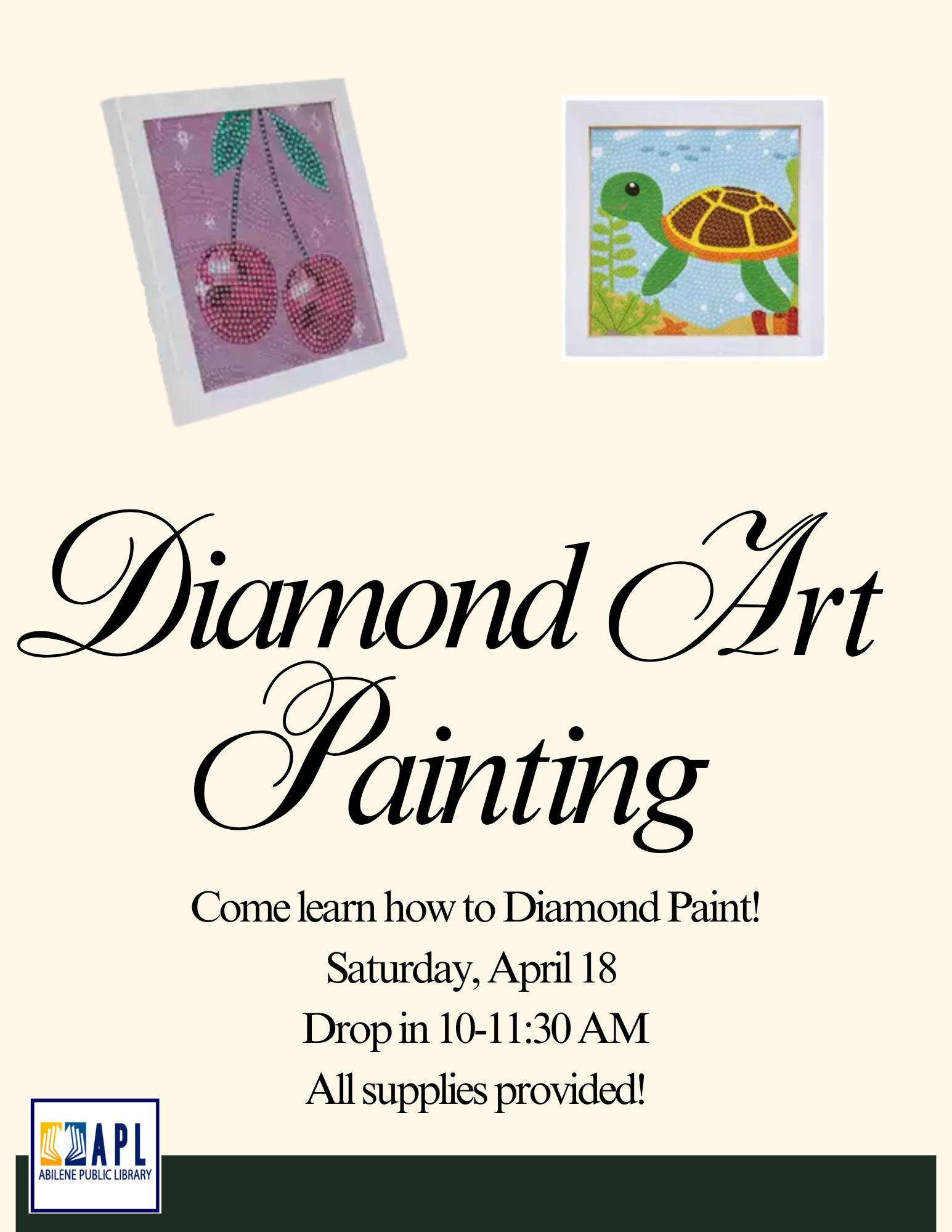 Come learn how to Diamond Paint! Saturday, April 18th Drop-in the Children's Library between 10 - 11:30 am All supplies provided!