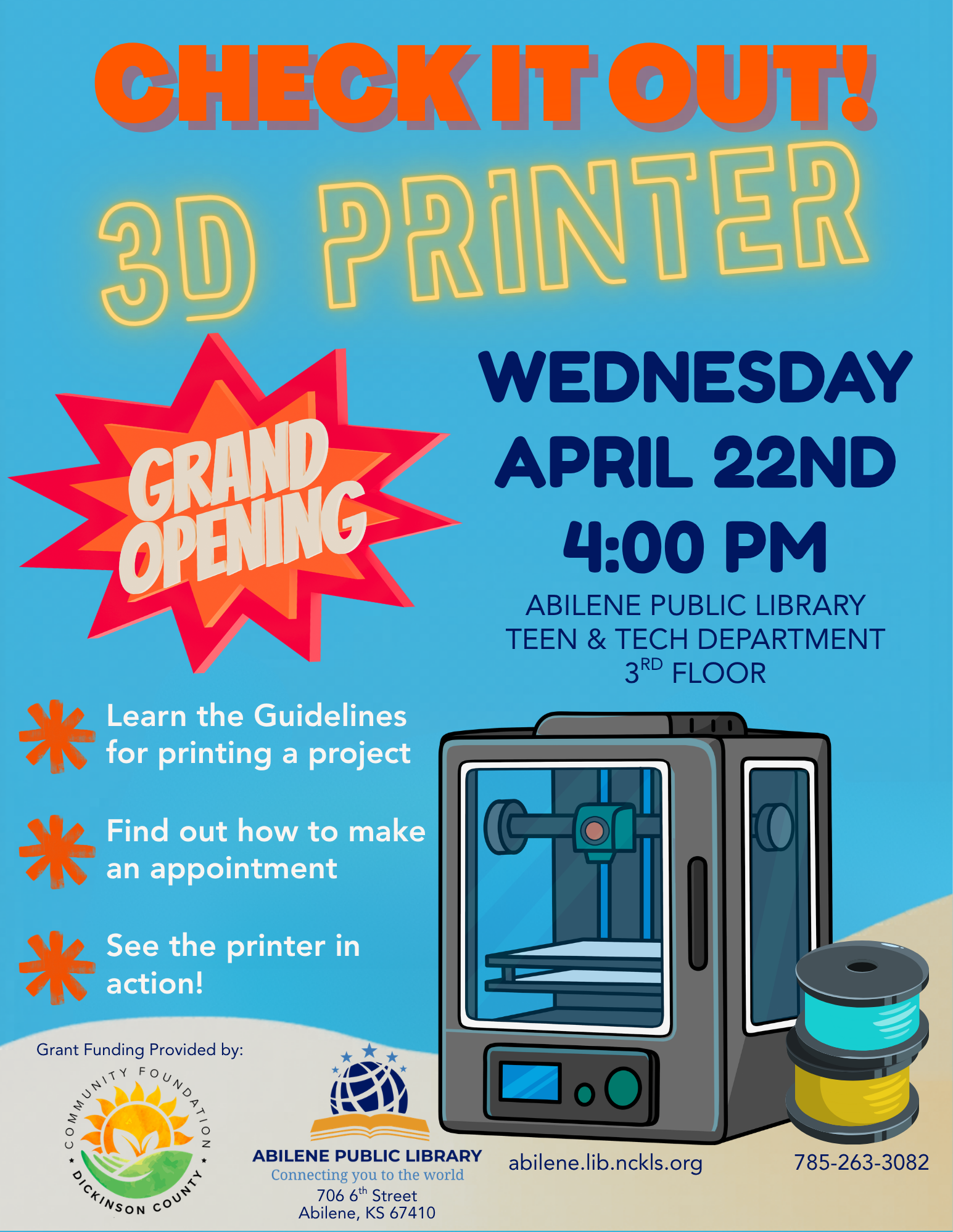 All AgesGrand Opening! Come and check it out! - Learn the Guidelines for printing a project -Find out how to make an appointment - See the printer in action! Wednesday, April 22 at 4 pm 3rd floor in the Teens and Technology Department