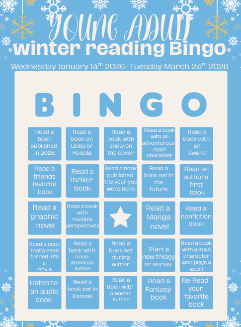 Winter Reading Bingo for the Teens! Stop by the Teens and Technology Area to pick up your bingo card, or save the image below. Starts January 14th. Return your bingo card by March 24th to earn prizes! Let’s Read!